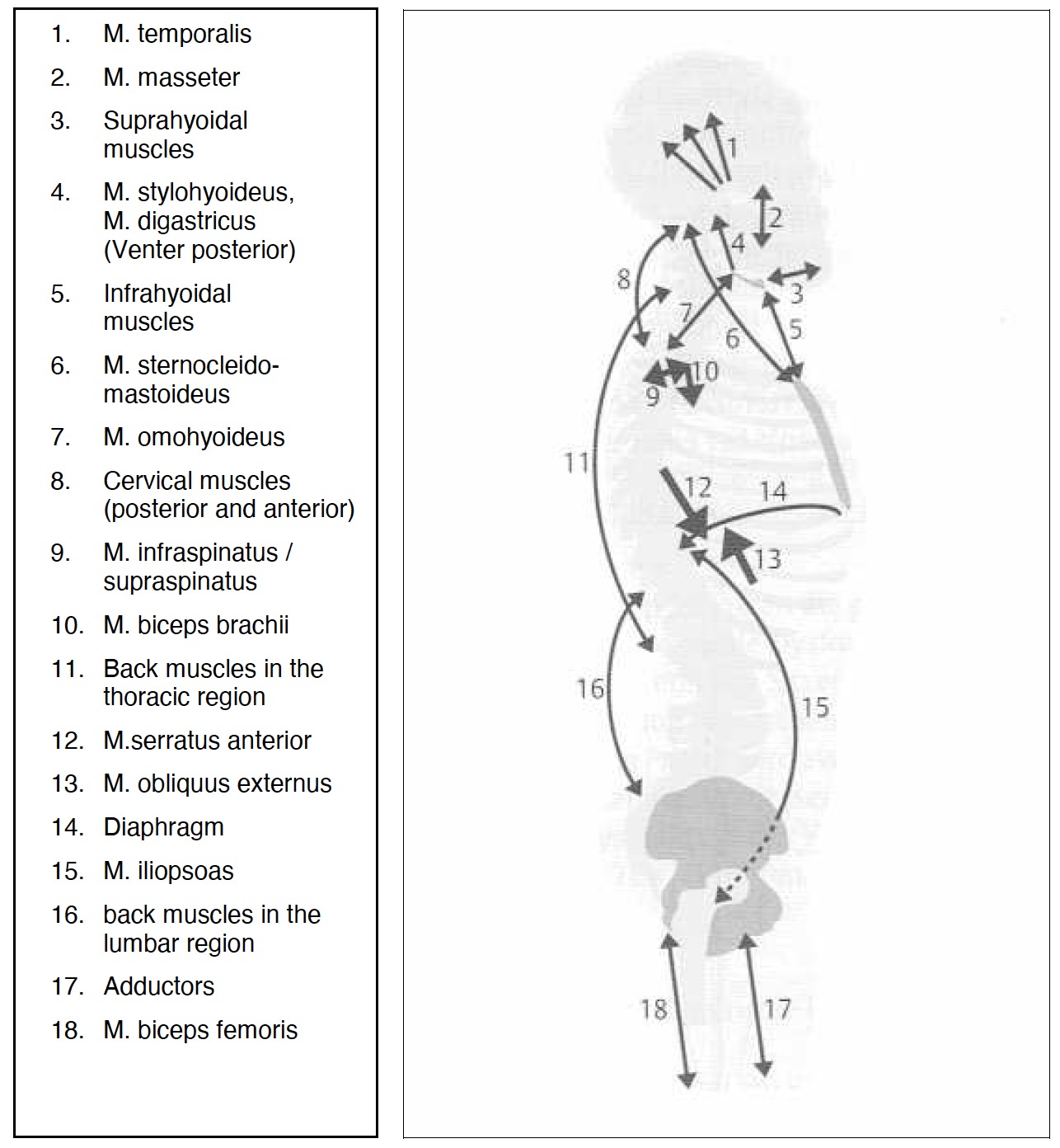 - the fascia of the M. temporalis, M. masseter, M. trapezius, sternocleidomastoideus and M. pectoralis major