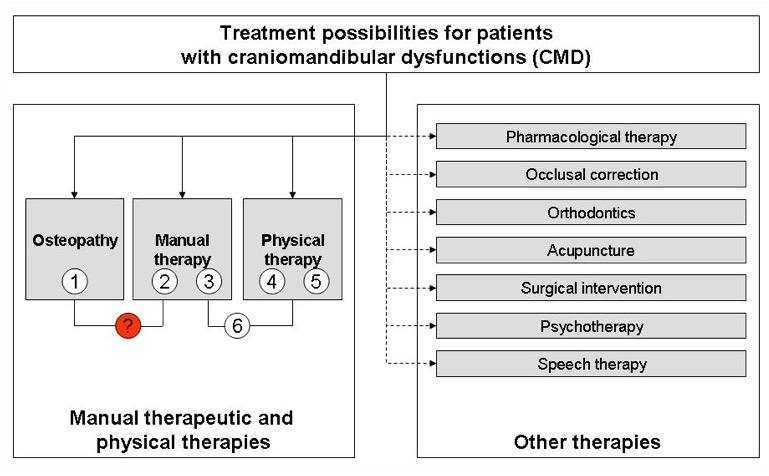 Considering the results of the literature research the first thing to be noticed is that only very few papers and studies evaluate the effectiveness of manual and physical therapeutic treatments for CMD. Only two studies provide some results for the physical therapy and two others regarding manual therapy. Although these studies indicate some significant improvements, they were only pilot studies and in part applied only one measurement method. So far there is only one pilot study looking at the effectiveness of osteopathy. But in this particular study an extraordinary treatment approach involving two therapists (four hand contact) was chosen. There is also only one pilot study to date comparing manual with physical therapy in the case of CMD.
