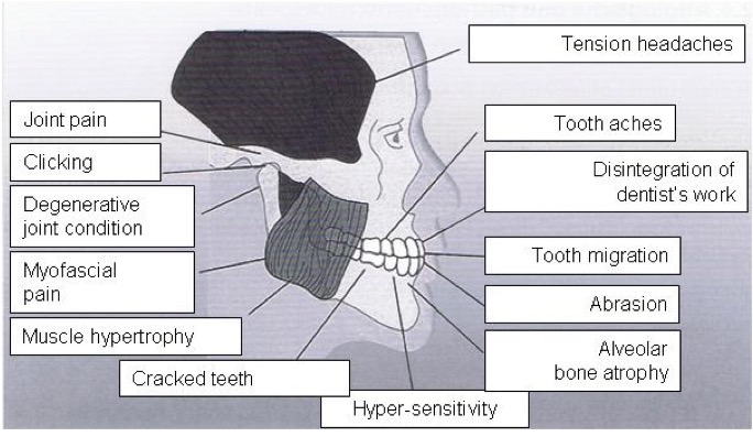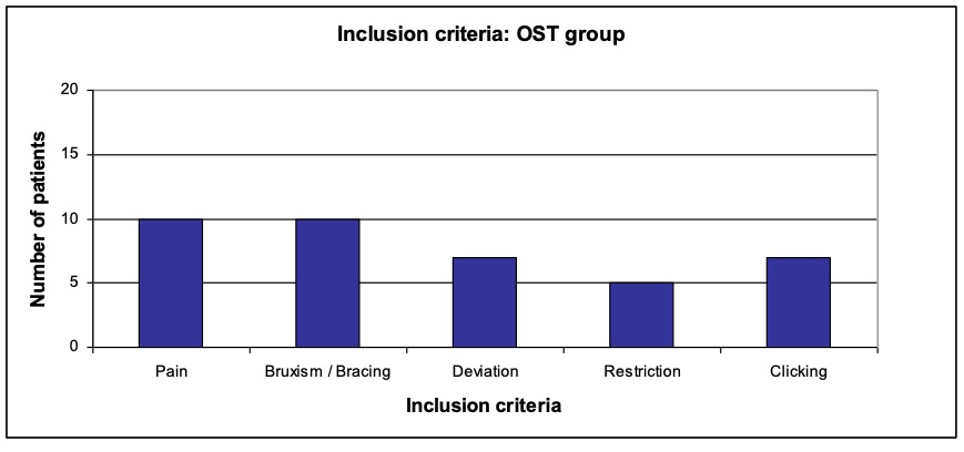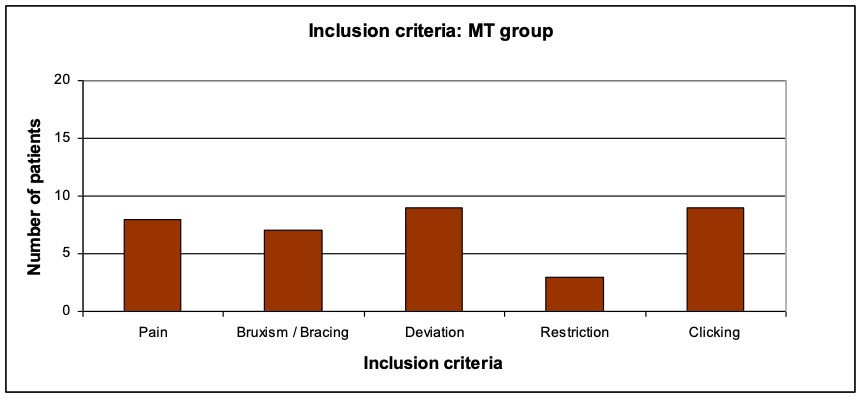 - Inclusion criteria: Pain in the region of the muscles of mastication, bruxism (grinding) or bracing (compressing), deviation when opening the mouth, restricted ability to open the mouth, clicking noise when opening the mouth.