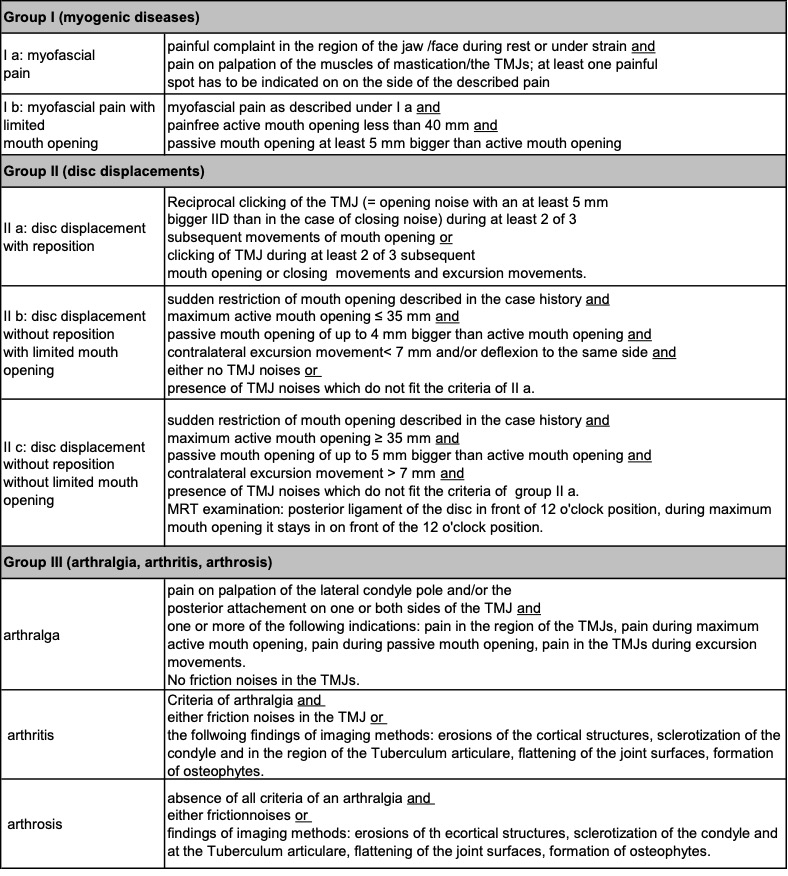 Many times the reason for this can be found in the complex and multi-causal interrelations and diversity of symptoms of the clinical picture of craniomandibular dysfunctions (CMD). Due to the lack of a clear leading symptom and the fact that various etiologic factors might have a different significance in each individual case, is it difficult to comprehend and classify CMD with its multi-faceted symptoms