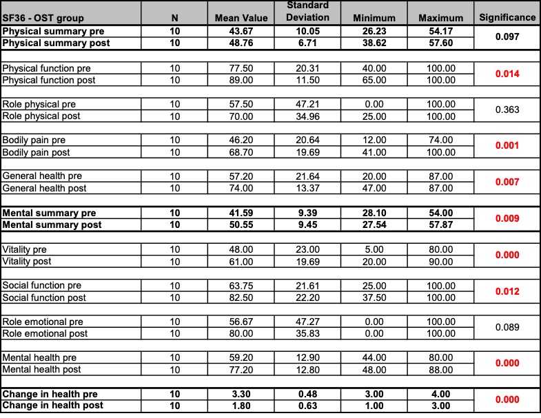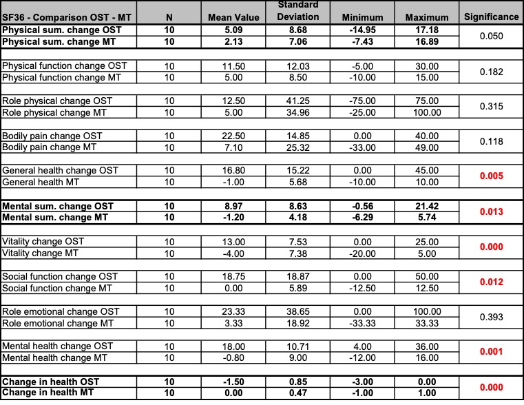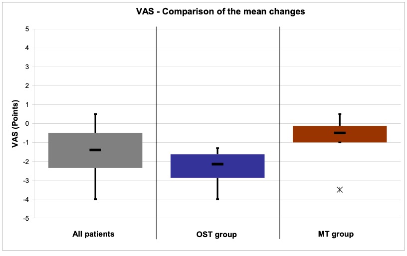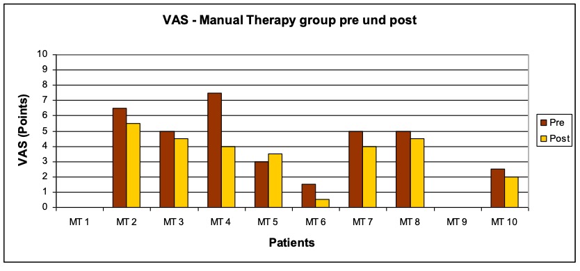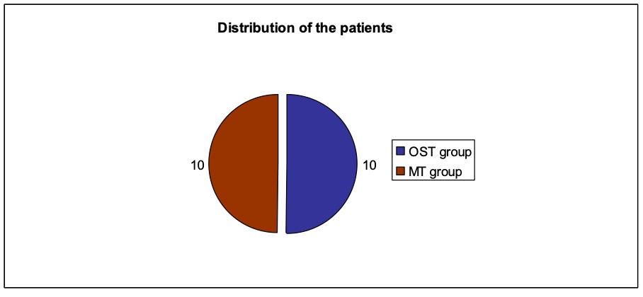 - Patients: 20 participants (18 female and 2 male) aged between 19 and 65 years. The patients were randomly divided into two groups. The result was a distribution of 10 patients (9 female and 1 male) in the study group osteopathy and 10 patients (9 female and 1 male) in the comparison group manual therapy (according to the CRAFTA® concept).
