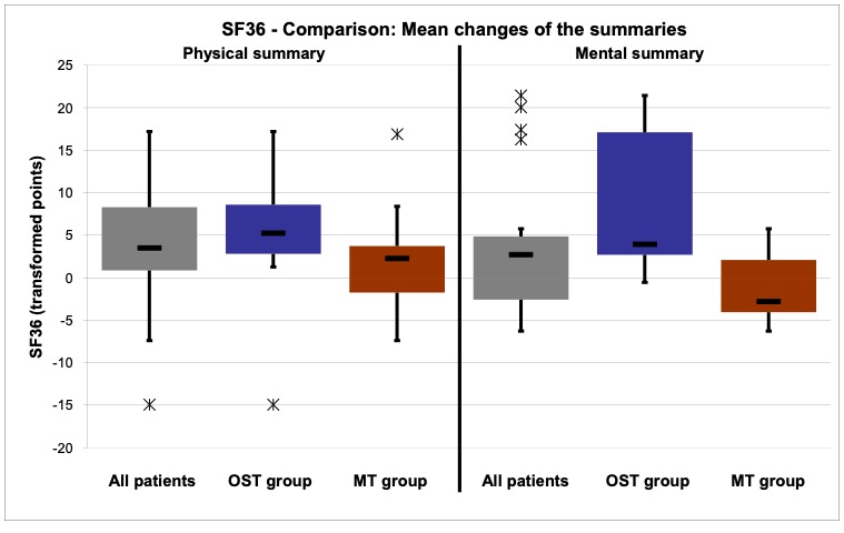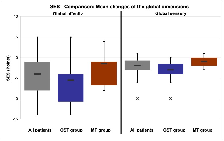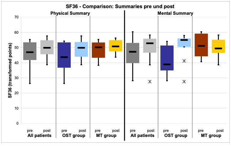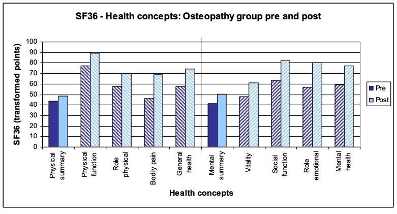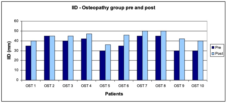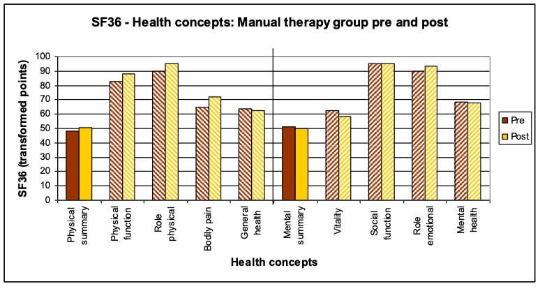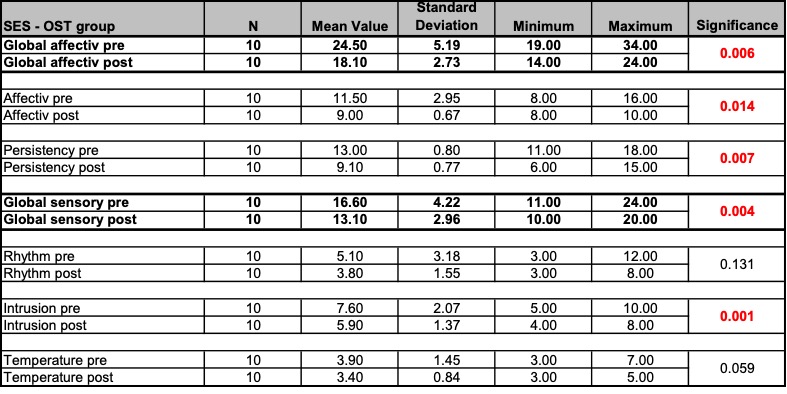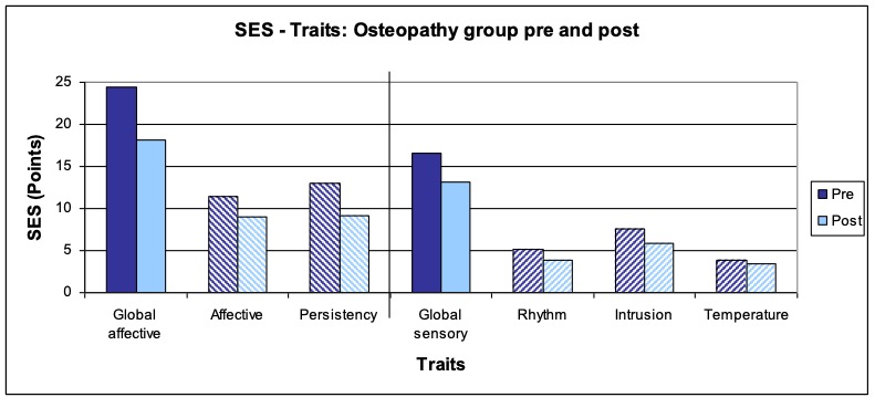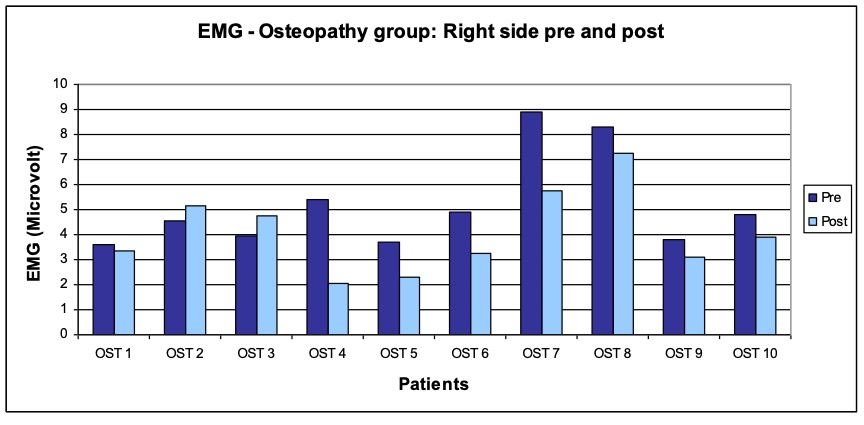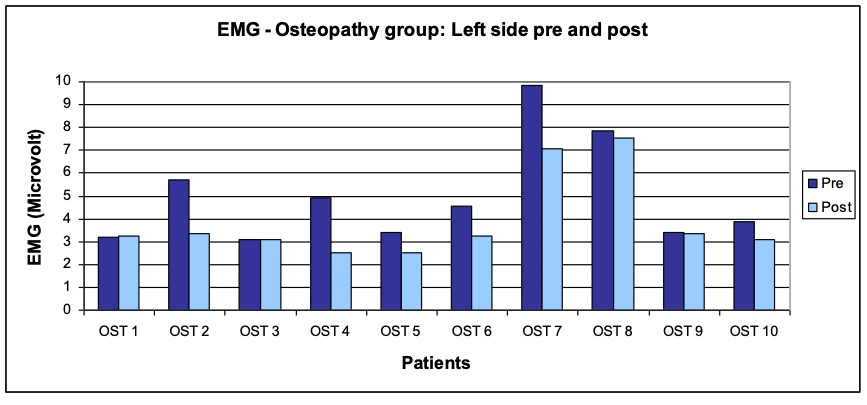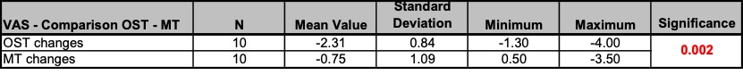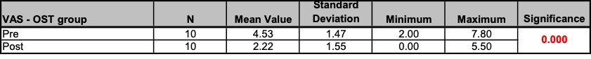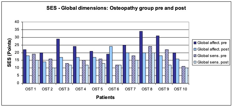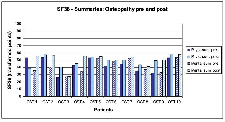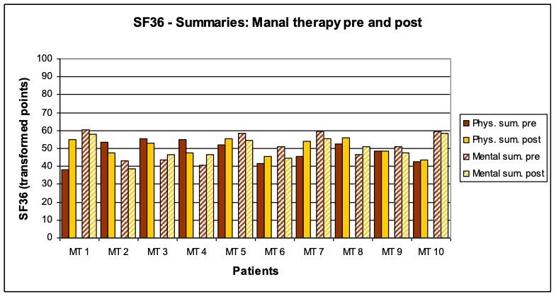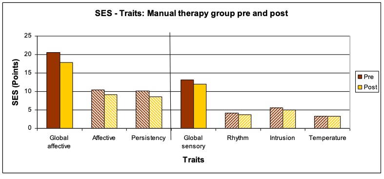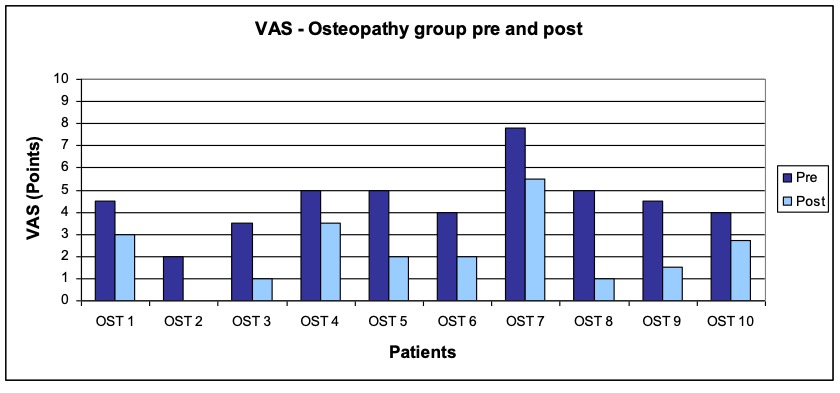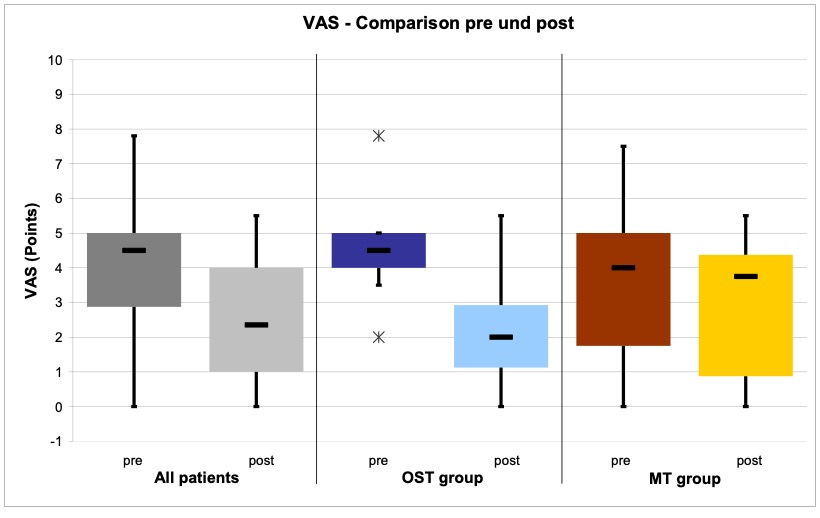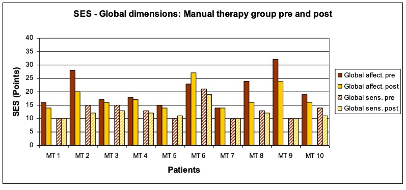 - Treatment procedure: Three treatments per patient within a period of two weeks following a black-box approach. The measurements and interrogations were carried out before the first and after the last treatment. The patients in the study group osteopathy were treated by the author Anett Hörster, the patients of the comparison group by a certified CRAFTA® therapist.