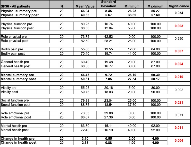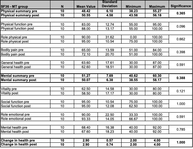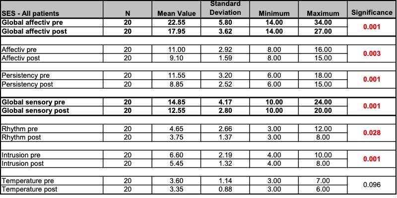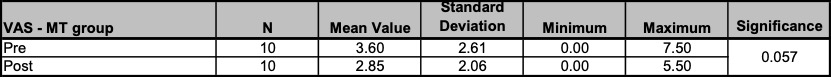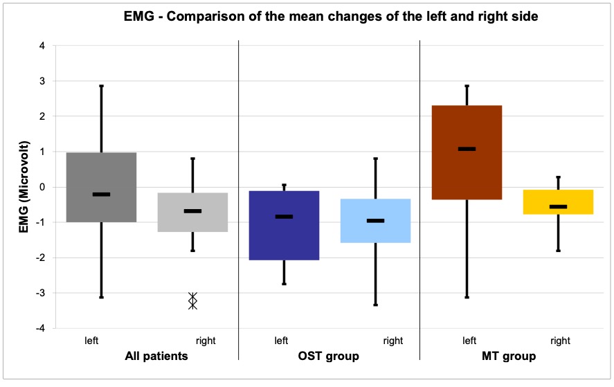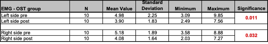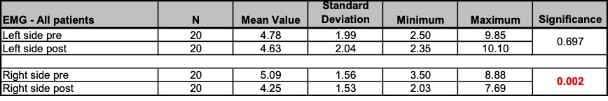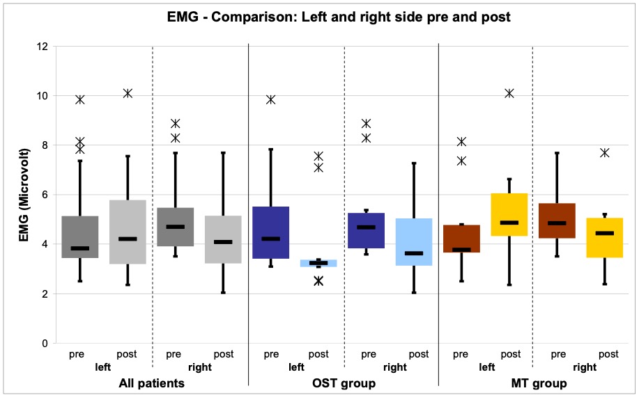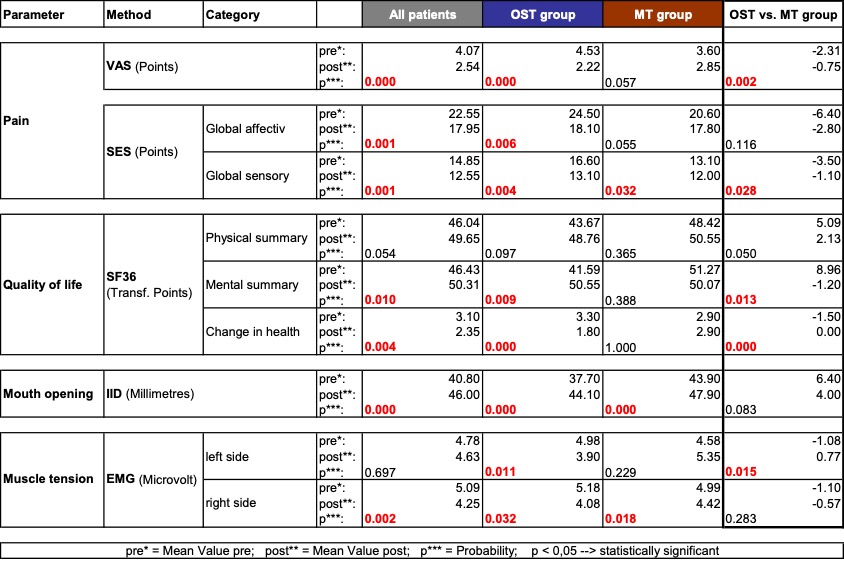 - Measurement parameters (and measuring methods): Pain (VAS assessment and SES questionnaire), health-related quality of life (SF36 questionnaire), mouth opening (inter-incisor distance (IID) measurement), muscle tension (Biofeedback EMG measurement).