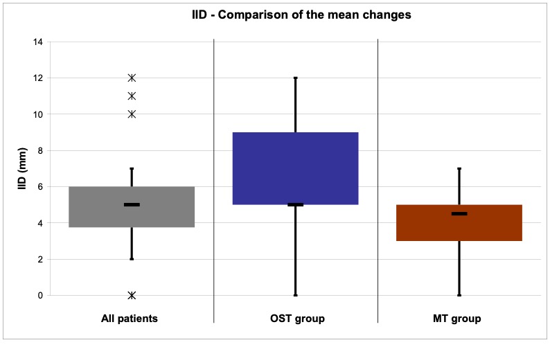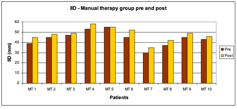 (cf. von Piekartz 2007). - In a randomized clinical pilot study Demling et al. (2008) compared the treatment of CMD with a Michigan splint with the treatment of a Michigan splint in combination with physical therapy (following the guidelines of manual therapy). In both groups a significant reduction of the overall pain, pain during rest and under strain could be observed as well as a significant improvement of the inter-incisor distance (IID). The comparison of the two groups showed that the difference was only significant regarding the active IID (significant improvement due to the combined treatment of a Michigan splint with physical therapy).