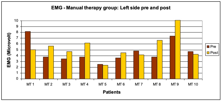 - A comparison of manual therapy and exercise therapy for craniomandibular dysfunctions was carried out by Knust (2006) in a pilot study. Both treatment methods showed significant improvements of the subjective pain perception, mouth opening and pain-on-pressure points in the muscles, with the pain perception clearly improving through manual therapy. The conclusion of this study by Knust is that both treatment options are effective with regard to CMD and should be used side by side to achieve the best possible synergy effects.